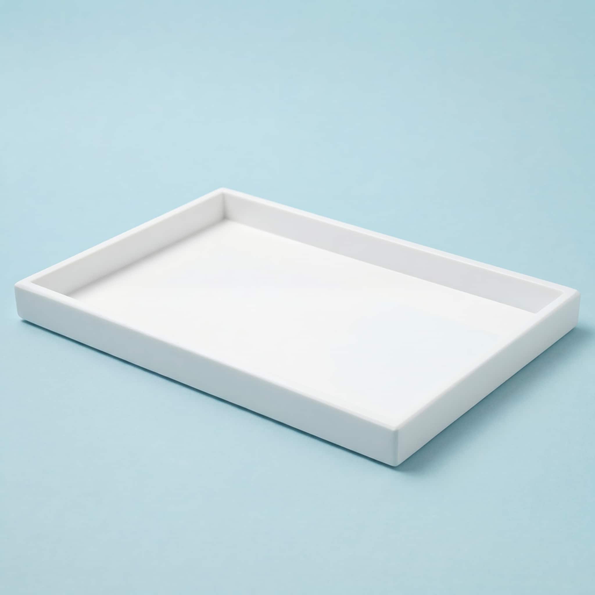 Entre sus principales características destaca su color blanco brillante que permite resaltar el contenido de la bandeja, facilitando la organización y exhibición de objetos como joyas, cosméticos, papelería o elementos de decoración. Su grosor de 3 mm asegura una estructura firme y duradera, capaz de soportar objetos sin deformarse o romperse fácilmente.