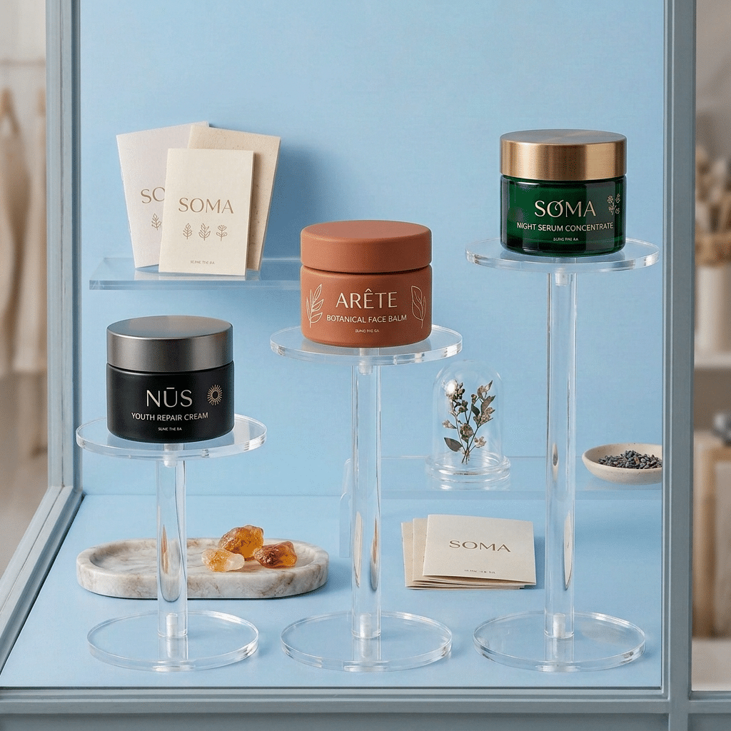 Este conjunto está fabricado en metacrilato de alta calidad, un material resistente y ligero que aporta un acabado cristalino y sofisticado. Su color transparente añade un toque moderno y minimalista, ideal para exponer pequeños productos.
