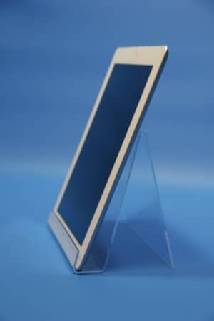 Medidas: 17x15x11 cm. (ancho x alto x profundo) Soporte para tablet modelo 301002 Fabricado en metacrilado de 2 mm de espesor Film de proteccion anti-ralladuras