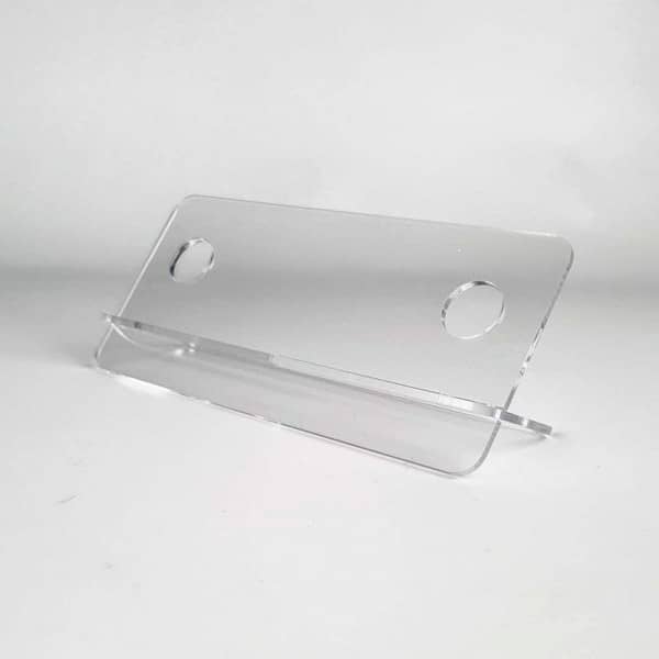 Soporte para movil modelo 804001 Medidas: 6x8x6 cm. (ancho x alto x profundo) Fabricado en metacrilado de 2 mm de espesor Film de proteccion anti-ralladuras