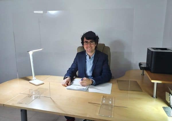 Mampara anticontagio fabricada en metacrilato de 5mm de espesor con cantos pulidos y film de protección