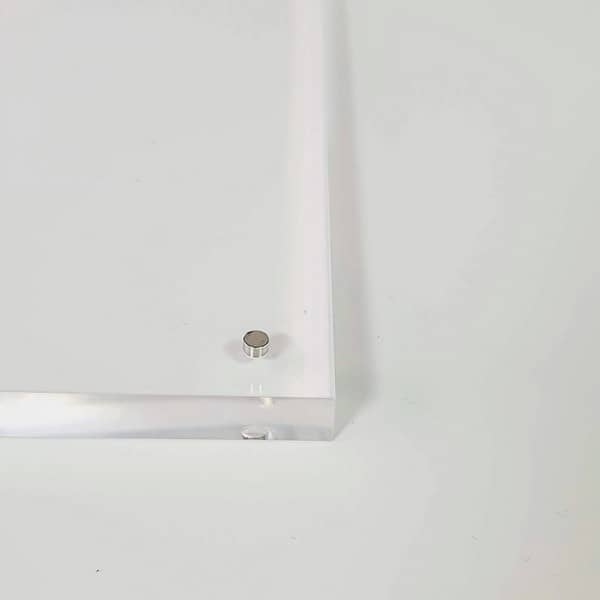 Portacartel de metacrilato bloque Para gráficas tamaño A5 (14,8 x 21 cm) Fabricado en metacrilato transparente Dos bloques de 1 cm de espesor Unidos mediante 8 imanes de neodimio Cantos pulidos…