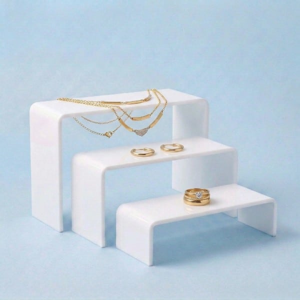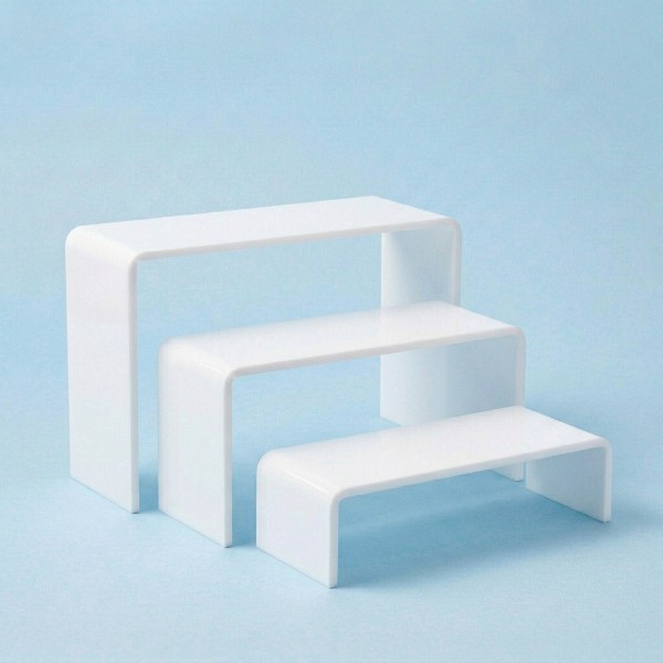 Su diseño en diferentes alturas facilita la exposición escalonada, maximizando la visibilidad y el atractivo de productos como joyas, figuras de colección, cosméticos o pequeños accesorios. Además, el acabado blanco brillante combina perfectamente con cualquier decoración, aportando un aspecto limpio y sofisticado.