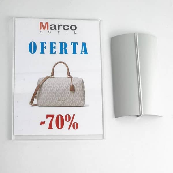 • Portacartel de metacrilato con base de aluminio • Tamaño A6 Vertical (10,5×14,8 cm) • La base de aluminio puede ser imprimible.