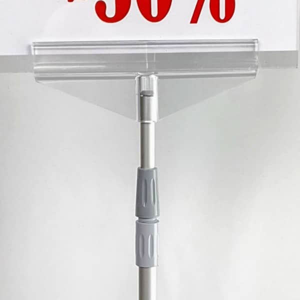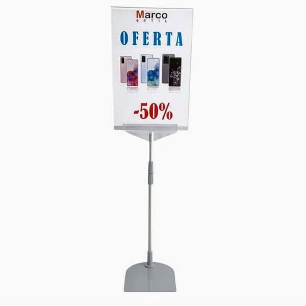 Portacartel de metacrilato tamaño A4 (21×30 cm) Mástil de aluminio regulable en altrura de 30 a 60 cm Visión a dos caras Base de acero lacada en gris Pinza encajable para colocar el portacarteles…