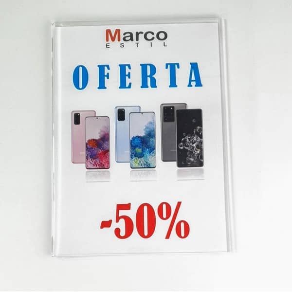 Fabricado en metacrilato de 2 mm de espesor con cantos pulidos y film de protección. Para carteles tamaño A4 (210×297 mm) Incluye 4 discos de adhesivo de doble cara