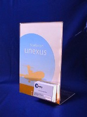 Portacartel con tarjetero A4 (21×30 cm) Fabricado en metacrilato de 2 mm de espesor con cantos pulidos y film de proteción. Tarjetero de metacrilato adhesivo de 10 cm. de ancho y 2.5 cm de capacidad.