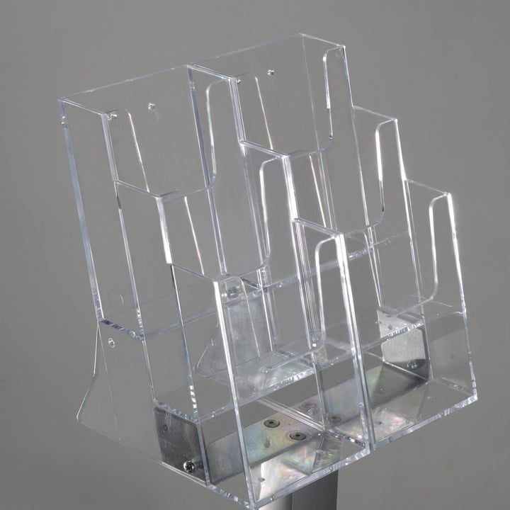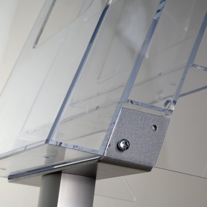 • Capacidad para 6 Portafolletos 1 / 3A4 (10×21 cm) • La altura del Portafolletos es de 1200 mm. • Base de estabilidad anodizado plata.