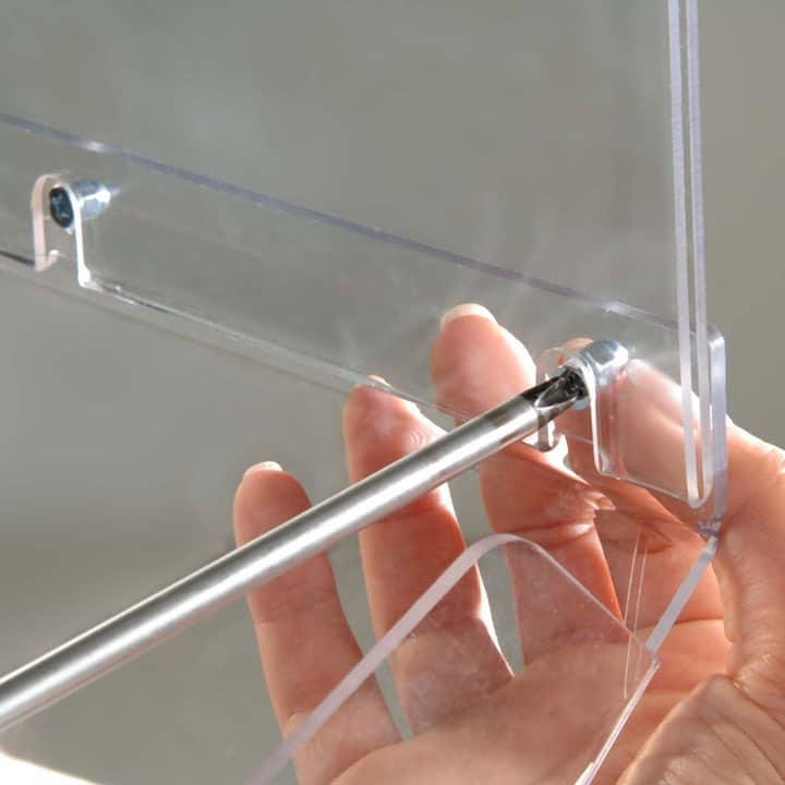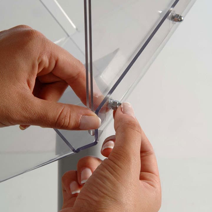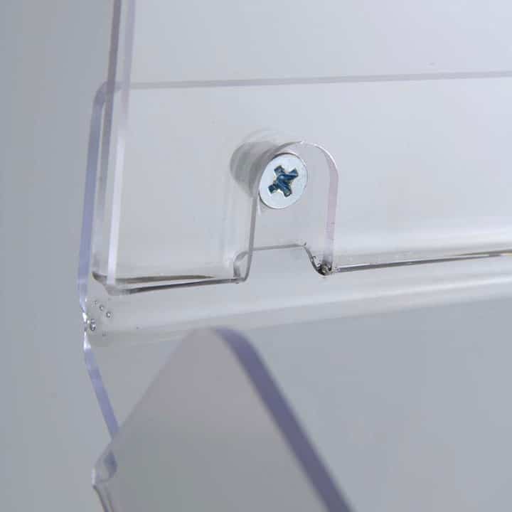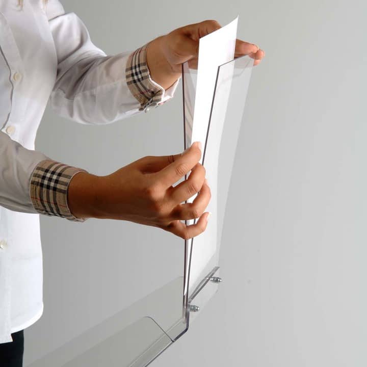•Para folletos con Portacartel A4 vertical • Altura 100 cm • Estructura de aluminio anodizado plata. • Cajetín superior fabricado en metacrilato de 4 mm de espesor