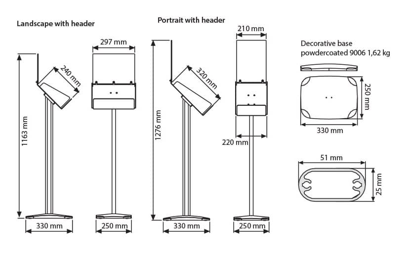 Portafolletos de pie base de aluminio y cajetin de metacrilato A4 Vertical con portacartel