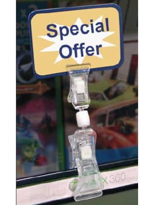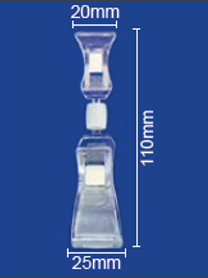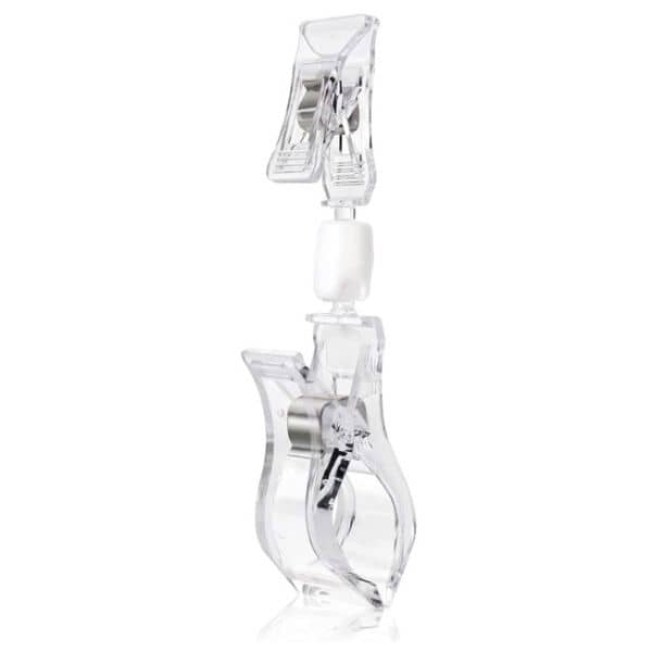 Portaprecios con doble pinza, fabricados poliestireno inyectado, capacidad de abertura de pinza inferior es de 30mm y el clip superor es de 15 mm. Altura de la pieza 110 mm