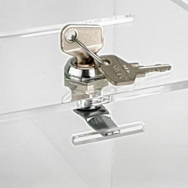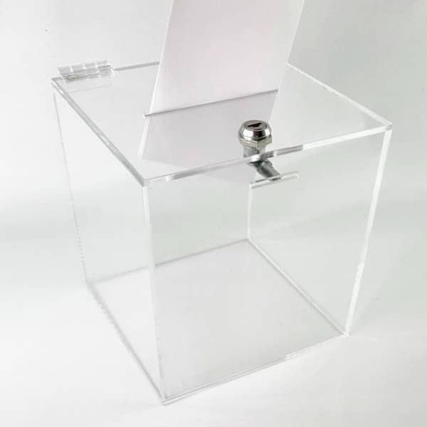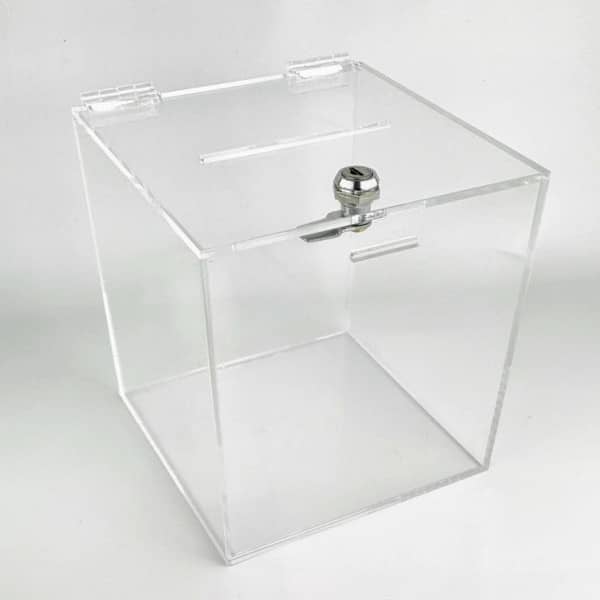 Medidas de la urna: 20x20x20 cm. (Medidas exteriores) Medidas de la ranura: 7×145 mm. Fabricada en metacrilato de 4 mm de espesor. Sorteos, votaciones, etc… Con bisagras trasnparentes. Con llave.