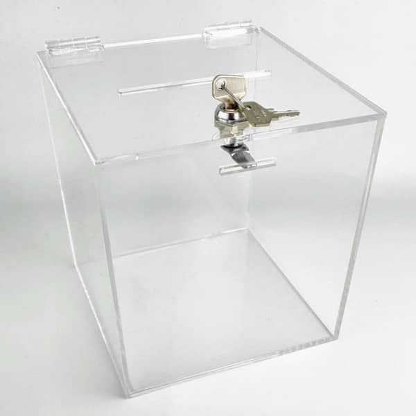Medidas de la urna: 25x25x25 cm. (Medidas exteriores) Medidas de la ranura: 7×145 mm. Fabricada en metacrilato de 4 mm de espesor. Sorteos, votaciones, etc… Con bisagras trasnparentes. Con llave.